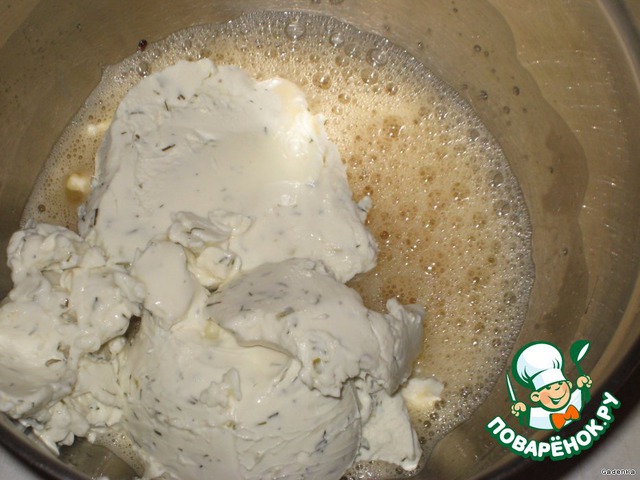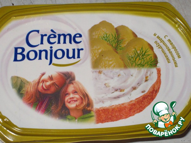 для заливки я взяла вот такой сливочный сыр со вкусом маринованных огурчиков, если брать обычный, то огурчики можно добавить в саму начинку, получается очень пикантно и вкусно.