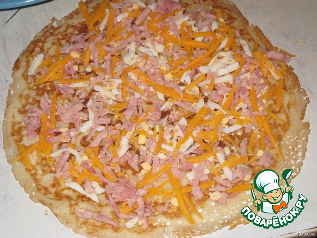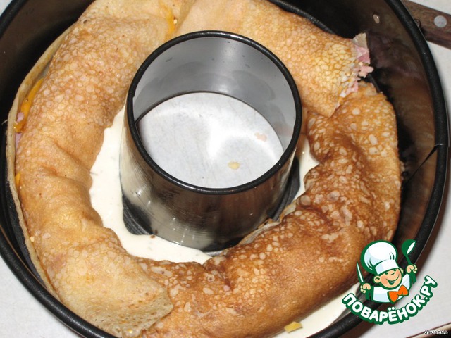 Понадобится несколько готовых блинчиков. У меня форма 18 см, небольшая, ушло всего 5 блинов.