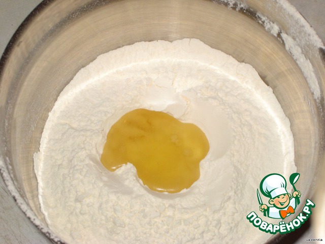 Муку смешать с солью, разрыхлителем, растительным маслом, слегка перемешать.