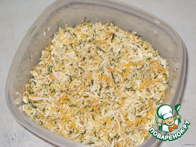 Для начинки, сыры и яйцо натереть на мелкой терке, выдавить чеснок, добавит красный перец, мелко покрошить укроп, все хорошо перемешать.