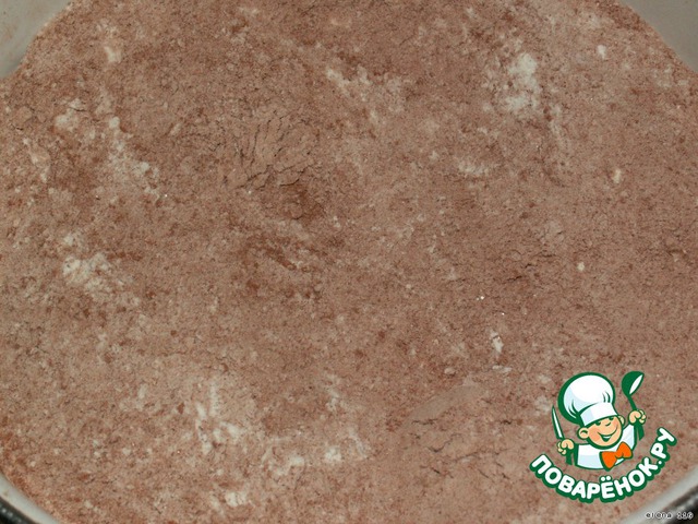 Смешать просеянную муку, сахар, просеянное какао, разрыхлитель, соду и соль. Соду НЕ ГАСИТЬ!