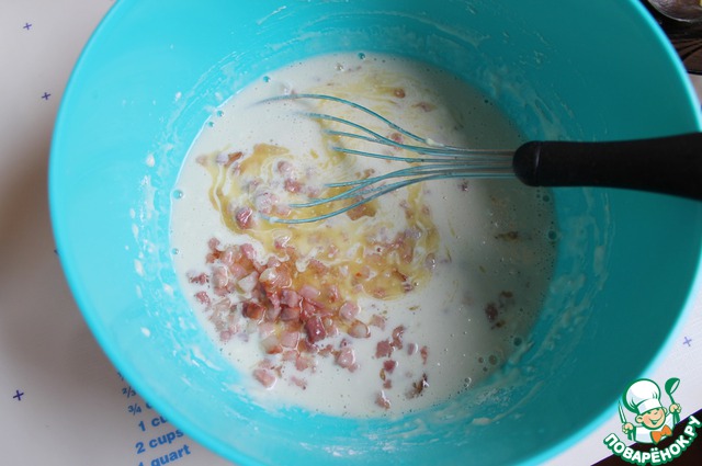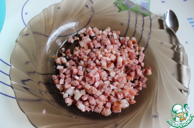 Для теста нам нужно нарезать мелко бекон и обжарить его, дать остыть.