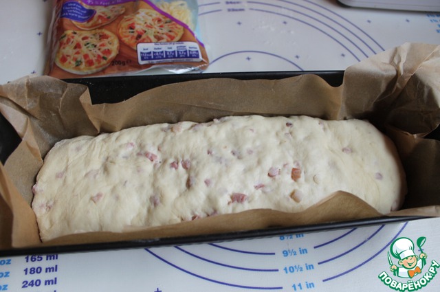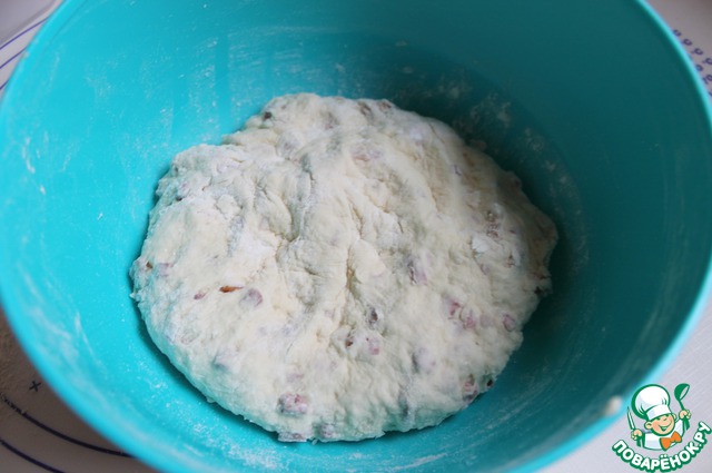 Размешаем в воде дрожжи, сахар, соль. Добавим бекон, масло сливочное мягкое. Постепенно добавим муку.