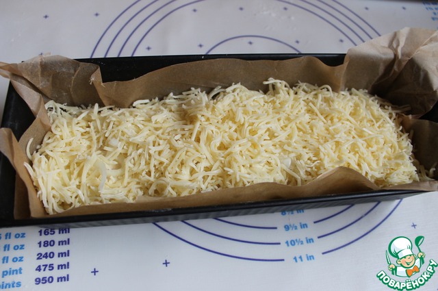 Когда тесто подошло, посыпаем сверху порезаным луком и тертым сыром. ставим в хорошо разогретую духовку до 180 градусов на 40 минут. Я накрыла тесто фольгой чтобы сыр сразу не подгорел, через 30 минут убрала.