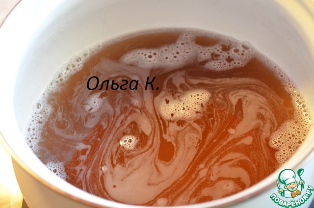 Сироп от груш уварить (10 минут), у меня получилось 1.5 стакана жидкости. Остудить. Тот желатин, который остался у Вас в стакане, если он застыл, то еще раз нагреть и влить в грушево-медово-коричный сироп (очень ароматно). Сразу сироп не вливайте, полностью остудите его, пусть он начнет загустевать, тогда и вылить его поверх творожной массы.