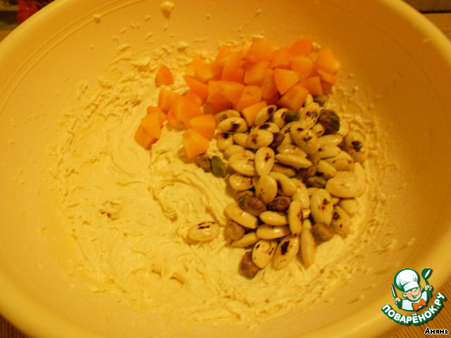 Муку смешать с разрыхлителем, ввести в сливочную массу и тщательно смешать. Добавить орехи и абрикос, аккуратно ввести в тесто.
