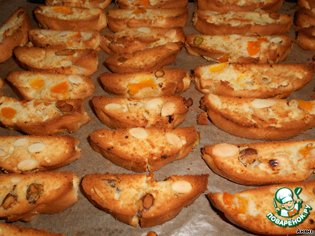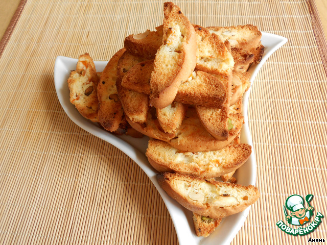 Это разновидность бискотти, главная особенность — добавление масла, в моем случае это сливочное масло. Классическое печенье готовится с миндалем, сейчас лето, и я решила добавить немного солнечного настроения — абрикос, и ярких красок — фисташки. Миндаль предварительно ошпарила кипятком, чтобы легко очистить скорлупу, а затем подсушила его в духовке.