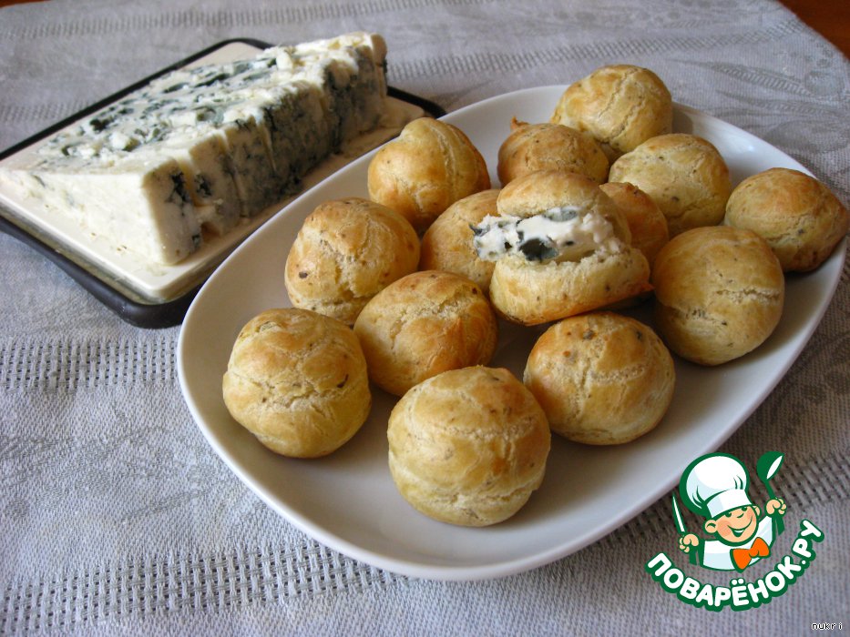 Вбивайте яйца по одному, вымешивая миксером до гладкости. Добавьте раскрошенный сыр, перемешайте. Сформируйте профитроли и выложите на покрытый пергаментом противень. Смажьте их яйцом.