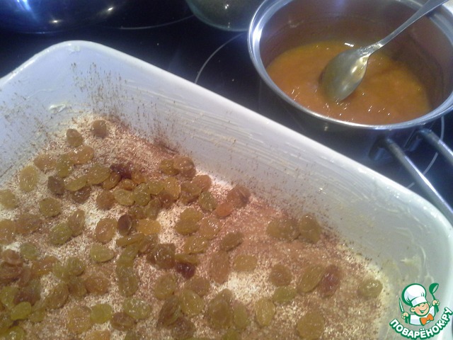 Форму для выпечки (у меня керамическая толстостенная) смазываем сливочным маслом, посыпаем 1ст. л. корицы и 2ст. л. сахара. На дно высыпаем весь изюм. Джем растапливаем, чтобы он был жидкий и выливаем на дно формы, оставив немного для глазировки готового пудинга.