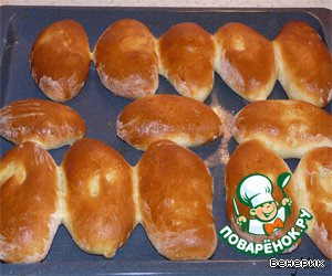 Заложить все ингредиенты в хлебопечку (по инструкции к вашей печке), выбрать программу "тесто" (у меня 2 ч. 20 мин.) и нажать на старт. По истечении времени достаём тесто, отрываем по кусочку и лепим пирожки. Кладём их на смазанный противень, накрываем полотенцем и даём постоять 15-20 минут. Затем смазываем яйцом и отправляем в духовку, нагретую до 200 градусов, на 20 минут.