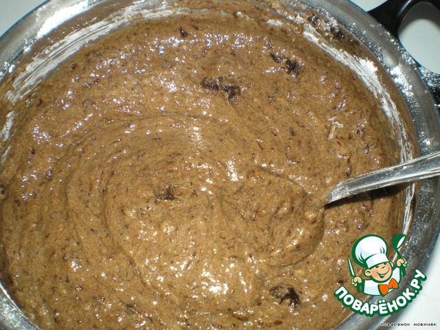 добавляем муку и хорошо перемешиваем, форму для выпечки можно смазать сливочным маслом и посыпать панировочными сухарями, а можно застелить бумагой для выпечки и выпекать нашу коврижку при температуре 180-200 градусов около 30-40 мин. (серединка не должна быть жидкой). Духовку не открывать около 30 мин.