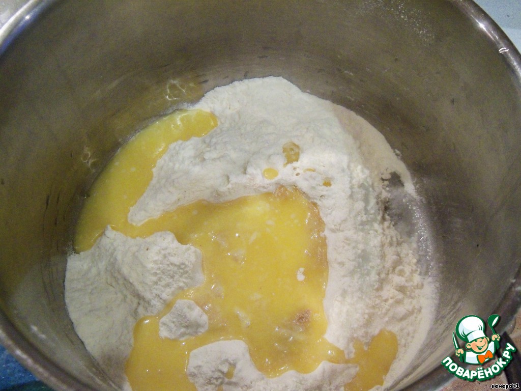 Просеять 200 г муки, добавить в нее 1 ч.ложку сухих дрожжей, соль, сахар, растопленное и охлажденное сливочное масло, переложить всю созревшую опару и вымесить тесто.