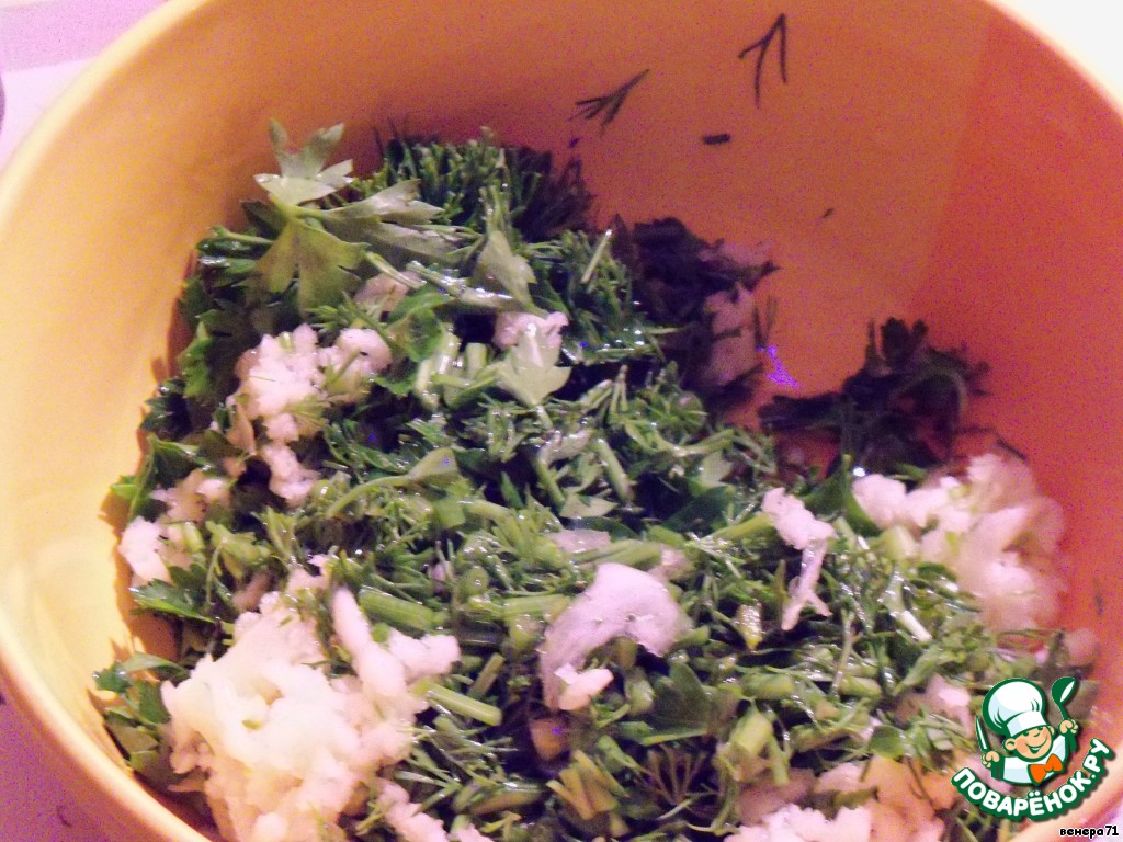 Приготовить начинку: зелень мелко порезать, чеснок выдавить (через чеснокодавилку), добавить 1 ст. ложку растительного масла и хорошенько все перемешать.