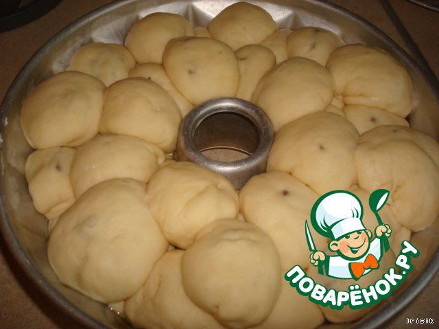 Форму для бабки, смазиваем подсолнечным маслом и посыпаем сухарями или мукой. Каждый шарик, складываем в форму в произвольном порядке. Верх бабки смазываем молоком.