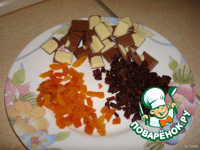Для начинки, курагу разрезаем на мелкие кусочки, изюм если крупный можно тоже порезать. Шоколадку разломать на дольки.