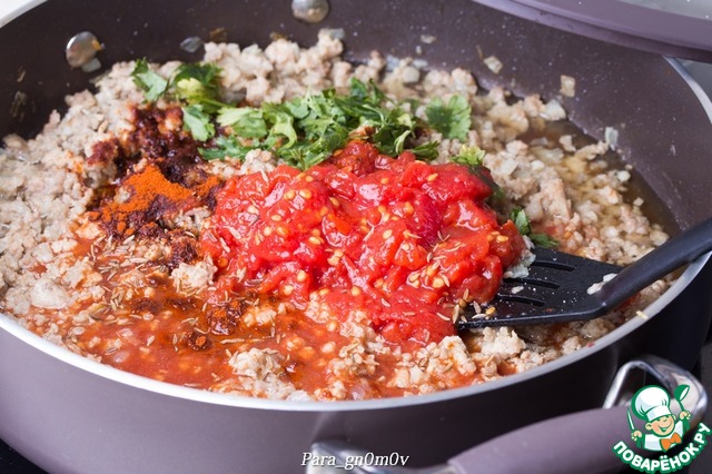 3. Томаты очистить от кожуры (если есть), мелко порезать. Петрушку мелко порезать. Добавить к фаршу петрушку, томаты (вместе с соком), воду, паприку, тмин. Подсолить и поперчить по вкусу. Потушить несколько минут (от 3 до 5).