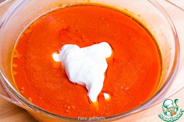 7. В соус добавить 100 мл сметаны и муку. Тщательно размешать до однородности. При необходимости выправить на соль.