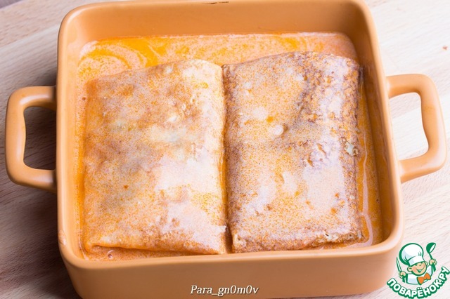 8. Духовку разогреть до 175 градусов. Залить блины получившимся соусом и запекать в духовке 15 минут. Подавать вместе с оставшимся в форме соусом.