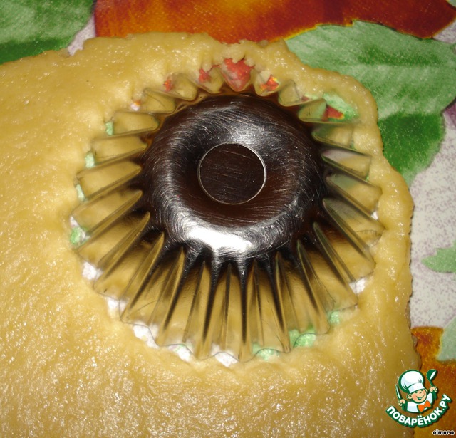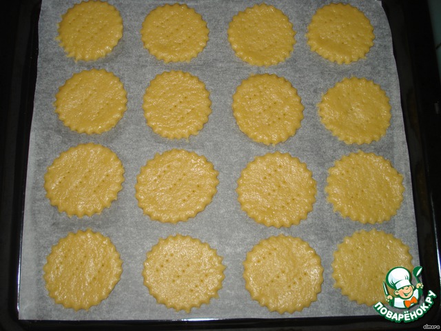 Раскатать тесто толщиной 0,5 см и вырезать кружочки (у меня получились фигурные, так как я взяла одну из своих формочек для кексов).
