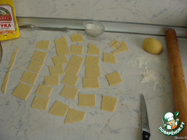 Займемся тестом. Раскатываем в пласт. Если пространство стола маленькое, можно разделить на несколько частей. Разрезаем пласт на квадратики. Размер квадратика, в принципе, любой. Самые маленькие я когда-то делала 3 на 3, на фото, где-то, 5 на 5 см.