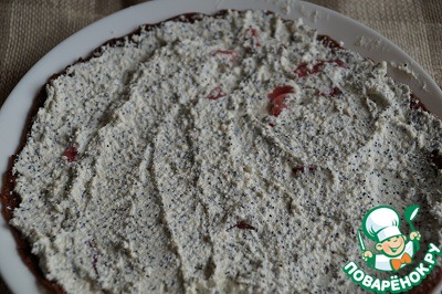 2 ст. л. мака заливаем 50 мл молока, добавляем сахар, оставляем минут на 10 (пока печем блины). Когда мак напитается молоком, добавляем к нему творог, сметану и нарезанный мармелад.