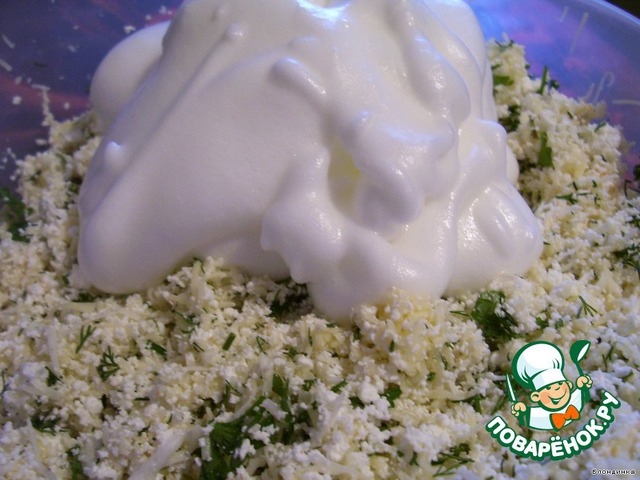 Смешиваем творог, сыр и зелень, добавляем соль перец по вкусу (если у вас сыр очень соленый, то можно и не солить). Белки взбиваем миксером (напомню на всякий случай, что для взбивания белки должны быть холодными) и осторожно подмешиваем к сыру с творогом.
