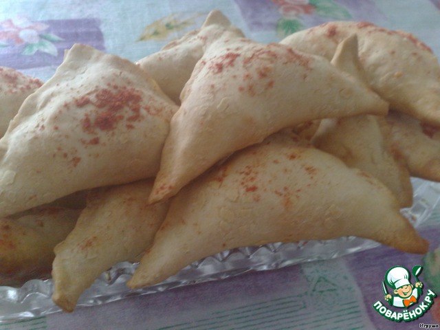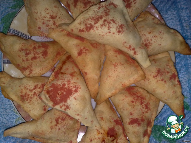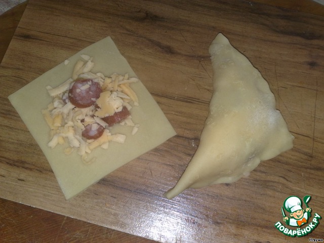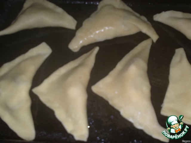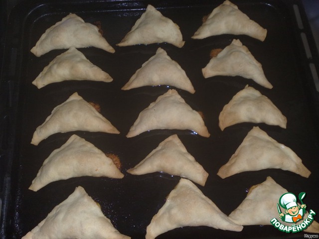 На каждый квадратик кладем начинку и защипываем края теста так, чтобы получился треугольник.