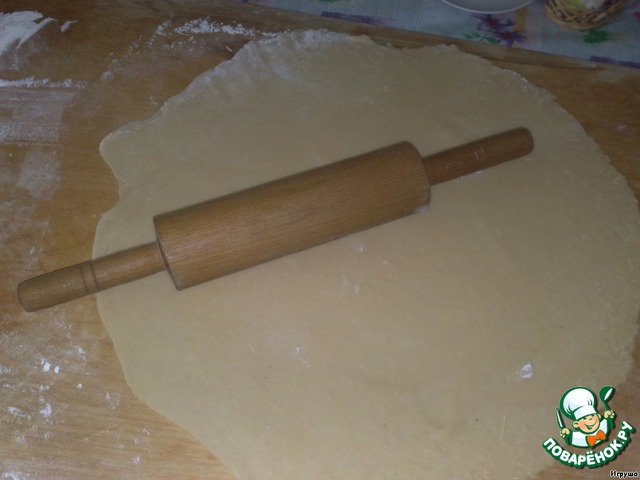 Тесто раскатываем тоненько на посыпанной мукой доске.