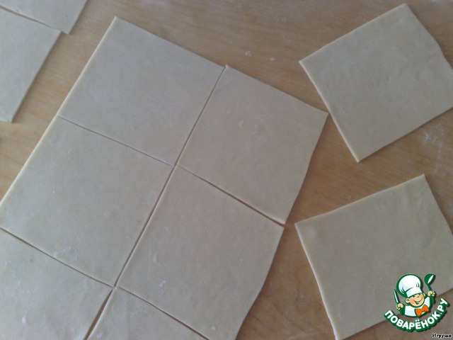 Разрезаем тесто на квадратики, примерно 10 на 10 см.