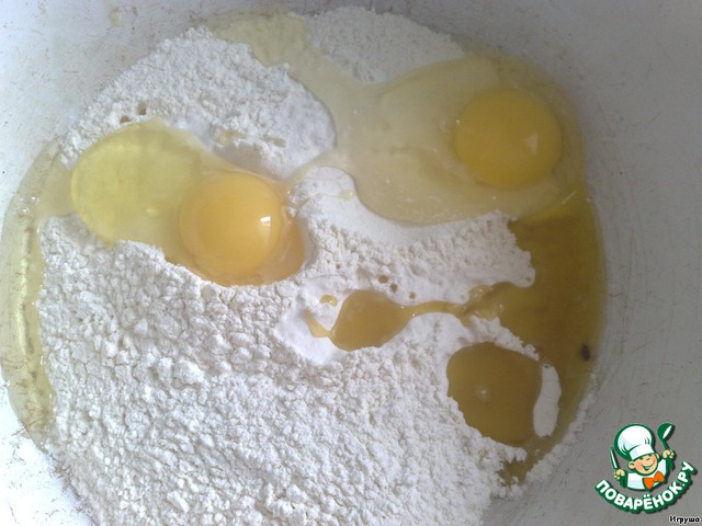 Просеянную муку, яйца, 2 ложки оливкового масла и щепотку соли смешать.