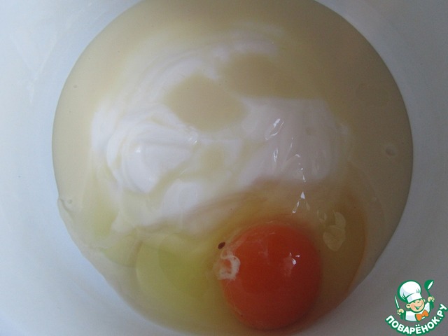 Пока шарлотка печется сделать заливку. Смешать сметану, сгущенное молоко и яйцо.