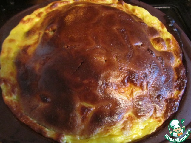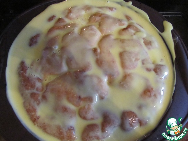 В форму для выпекания вылить половину теста, затем выложить половину яблок и снова тесто и яблоки. Выпекать шарлотку в разогретом до 170 градусов духовом шкафу 20 минут. Форму лучше взять поглубже, так как тесто сильно поднимется, а нам сверху еще нужно вылить заливку.