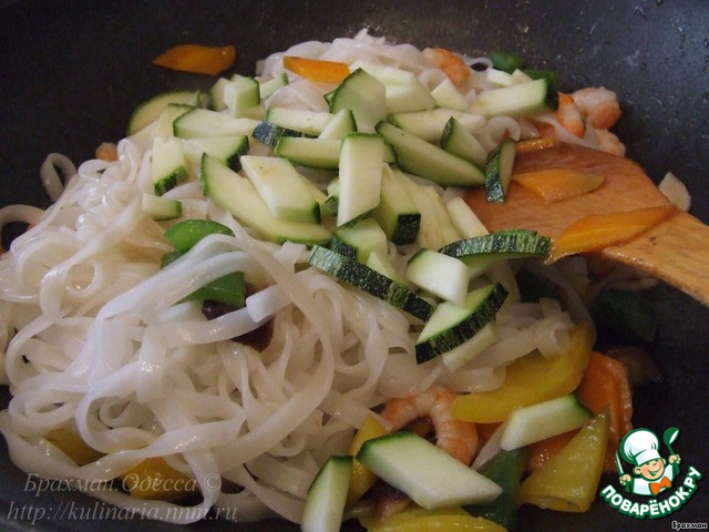 - Еще через пару минут добавляем лапшу и цукини.