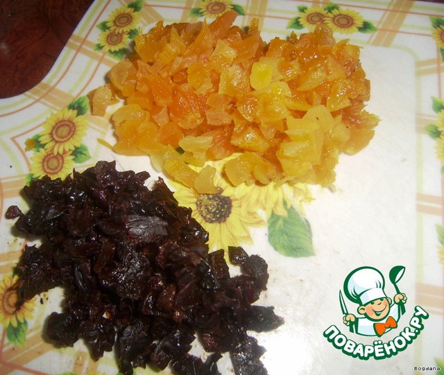 Сначала надо подготовить курагу и чернослив. Хорошо промыть их, залить горячей водой и оставить набухать где-то на минут 30-40. Набухшие курагу и чернослив мелко нарезать.Творог лучше протереть через сито, чтобы не было комков. Добавить сахар по вкусу и перемешать. Добавить в творог яйцо и муку и хорошо перемешать. Если творог влажный муки может понадобиться больше. Добавить немножко ванилина и цедры апельсина.