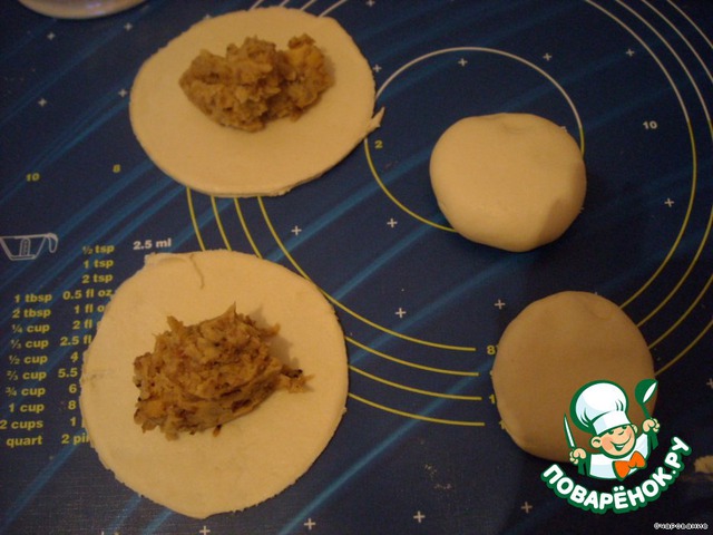 Вырезаем кружочки, ложим начинку и защипываем.