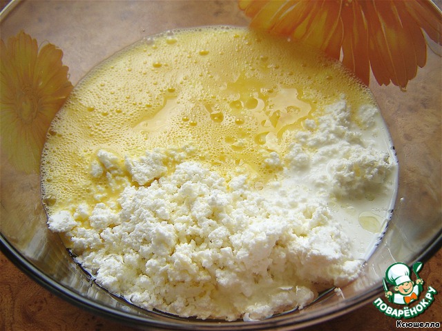 Теперь смешиваем в отдельной емкости творог, молоко, слегка взболтанные вилочкой или венчиком яйца и растопленное сливочное масло, которое можно заменить таким же количеством растительного.