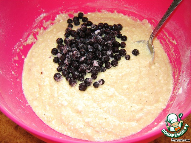 Соединяем наши сухую и жидкую смеси, размешиваем почти до однородности и добавляем чернику. Можно взять замороженные ягоды, при этом их предварительно размораживать не обязательно.