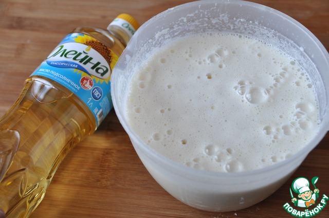 Наливаем подсолнечное масло "Олейна" (2 ст. ложки). Взбиваем.