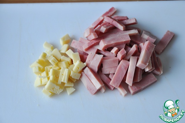 Берём твёрдый сыр и ветчину, нарезаем кубиками или тонкими полосками. Можно брать любые мясные продукты, которые есть в наличии: отварное мясо, курица, сардельки, грудинка и т. д.