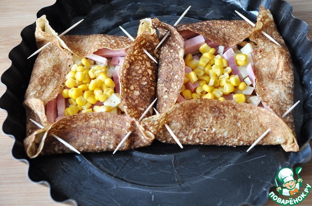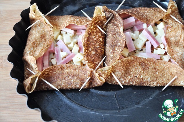 Кладём скрепленные зубочистками блины в форму для выпекания. Внутрь блинов кладём сыр и ветчину.