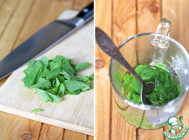 Вообще по рецепту используется только мятный сироп или мятная эссенция. Но у меня таковой не оказалось. Что делать в такой ситуации? Все просто. Мелко режем небольшой пучок мяты, половину разминаем ложкой и заливаем парой ложек кипятка и водки, еще раз разминаем ложкой и оставляем остыть до теплого состояния. Это будет наш "мятный сироп".