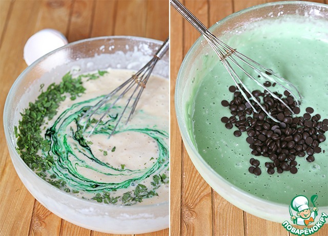 Добавляем порезанную мяту, мятный сироп, ванильную эссенцию (или ванилин), зеленый краситель (по желанию), размешиваем, добавляем шоколад и снова размешиваем. Тесто готово.