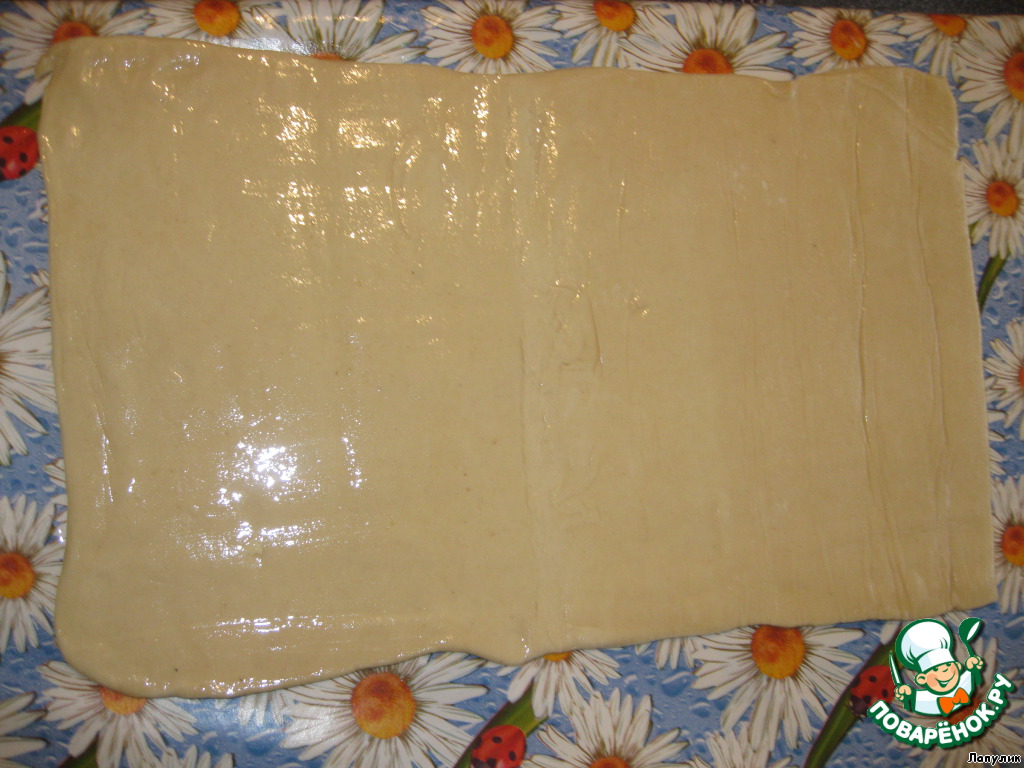 1. Раскатать тесто слегка, в одном направлении. И смазать растительным маслом.