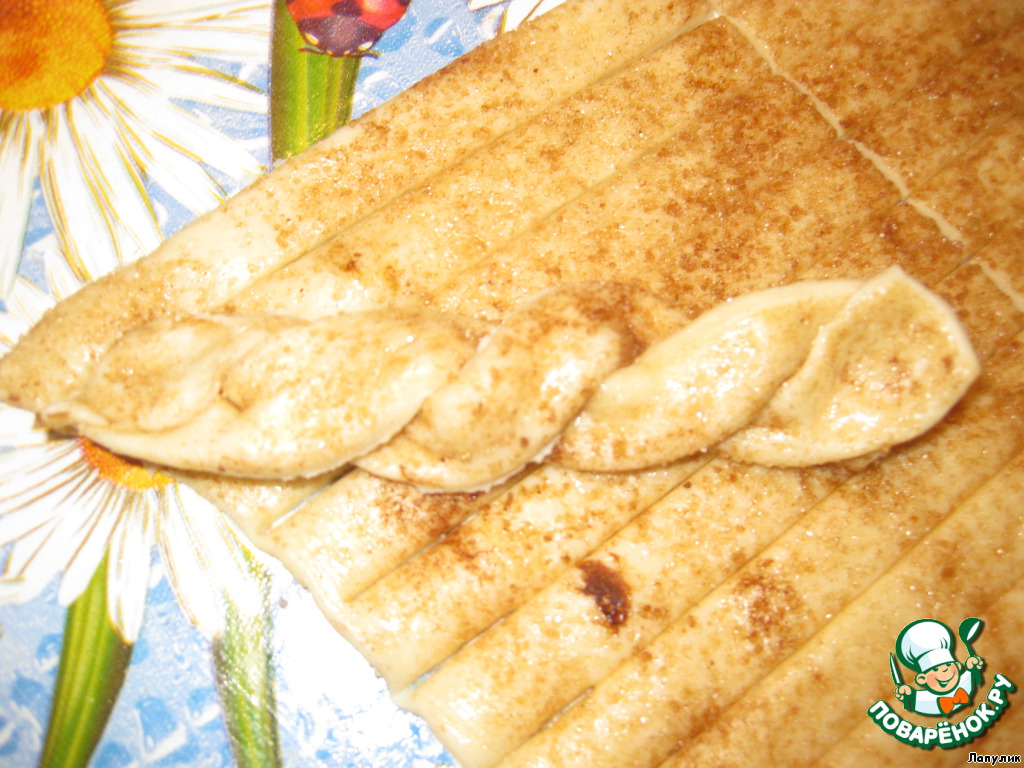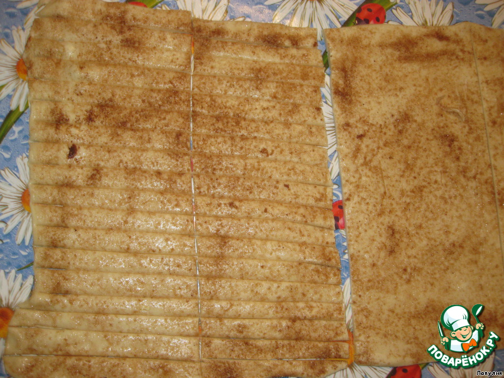 3. Щедрo посыпать тесто по всей поверхности смешанным с корицей сахаром. Разрезать на полоски.