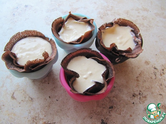 В высокие силиконовые формочки выложить по блинчику, заполнить творожной основой, отправить в духовку на 20 минут при температуре 180 С. (ориентируйтесь по характеристикам своей духовки!). Сверху на готовые блинчики-запеканки выложить по ложке мороженого (домашнего или магазинного), украсить ягодами или вареньем по вкусу!