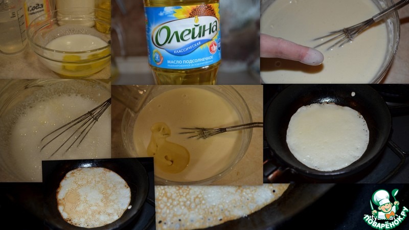 Я же завожу тесто так: яйца перемешиваю с простоквашей, добавляю соль, сахара. Соду гашу уксусом и выливаю туда же. Добавляю воды (знаю, что сейчас полетят копья-надо добавлять сначала муку, а потом воду, но вот уж так я привыкла, пеку уже много лет и никак не могу переучиться). И высыпаю муку. Так как разная мука впитывает влагу по разному, то затем водой довожу тесто до нужной мне консистенции. Когда тесто стало хорошим жидким (но чтоб не брызгалось), наливаю растительного масла-до "бульков", чтобы масло вышло на поверхность лужей))) Я пеку сейчас блины на растительном масле "Олейна". Сегодня я специально измеряла все пропорции. Вдруг кому-то пригодится и мой рецепт блинов.