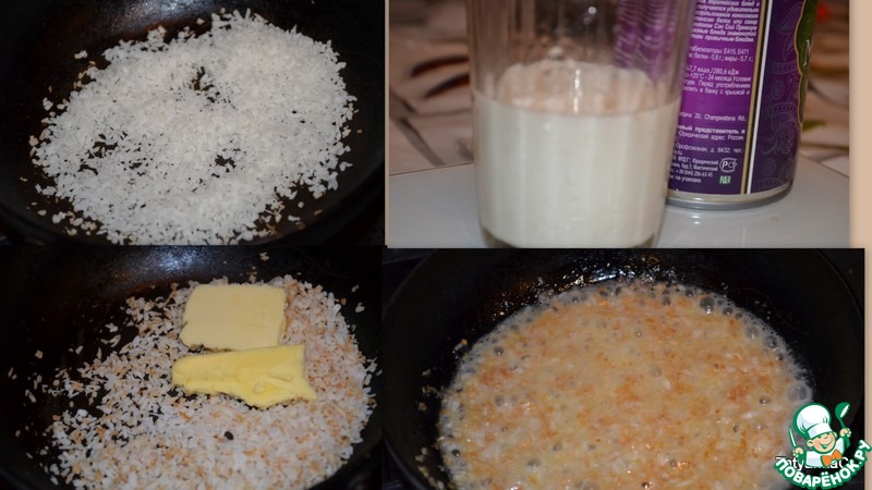 Вторая начинка кокосовая. Слегка поджариваем на сухой сковороде кокосовую стружку до золотистого цвета. Добавляем к ней сливочное масло, мед и кокосове молоко. Держите до тех пор, пока почти вся жидкость не выпарится. Убираем охлаждаться.