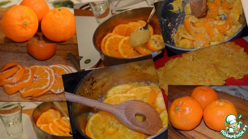 Пока пекутся блины можем и начинками заняться. Для мандариновой начинки тонко нарезаем мандарин вместе со шкуркой (собираем аккуратно при этом сок). Кладем в сотейник, добавляем сок, воду и мед. Томим на медленном огне, периодически помешивая. Чтобы почти вся жидкость выпарилась, а шкурки стали почти прозрачными. Пробиваем блендером и остужаем.
