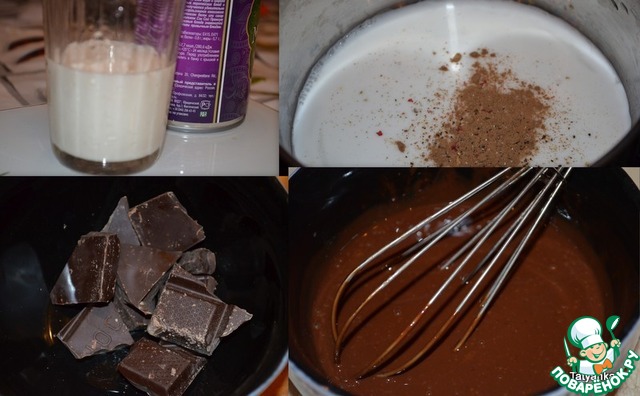 Тут же делаем шоколадный ганаш. Нагреваем кокосовое молоко со специями и перцем (при желании). Снимаем с огня. Накрываем крышкой минут на 15, чтобы настоялось. Шоколад растопим. Аккуратно в него тонкой струйкой вводим кокосовое молоко. Перемешиваем до однородности.