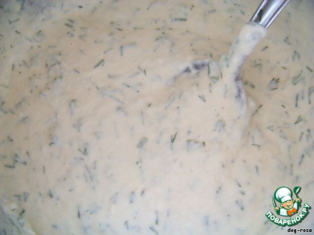 Смешиваем все составляющие для теста (молока можно добавить больше или меньше, в зависимости от того, какой толщины хотим получить оладьи), за исключением зелени, добавляем немного соли, даем постоять 20 минут.